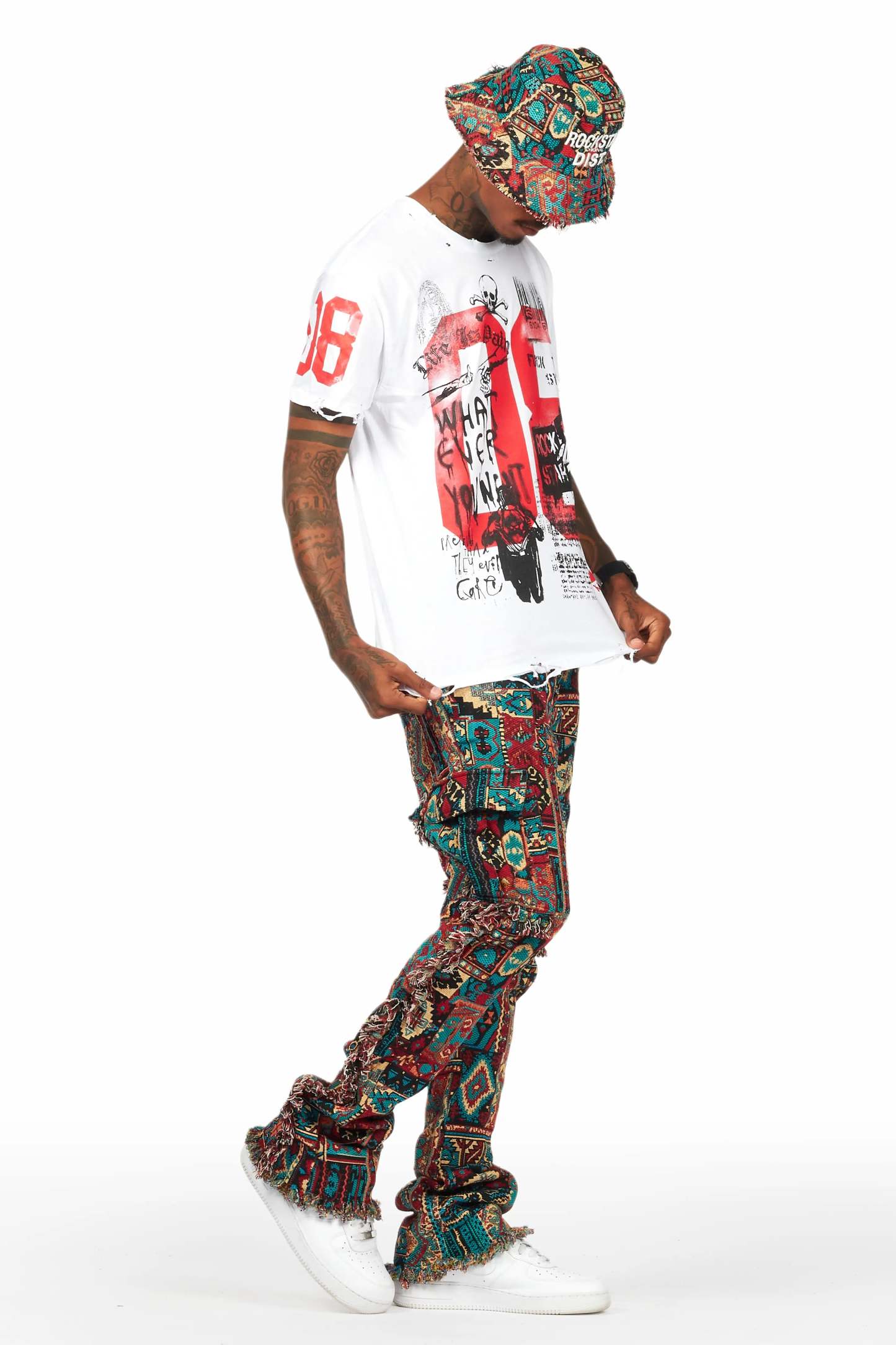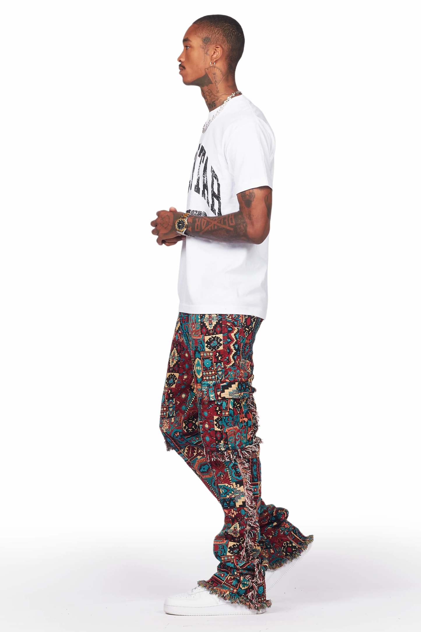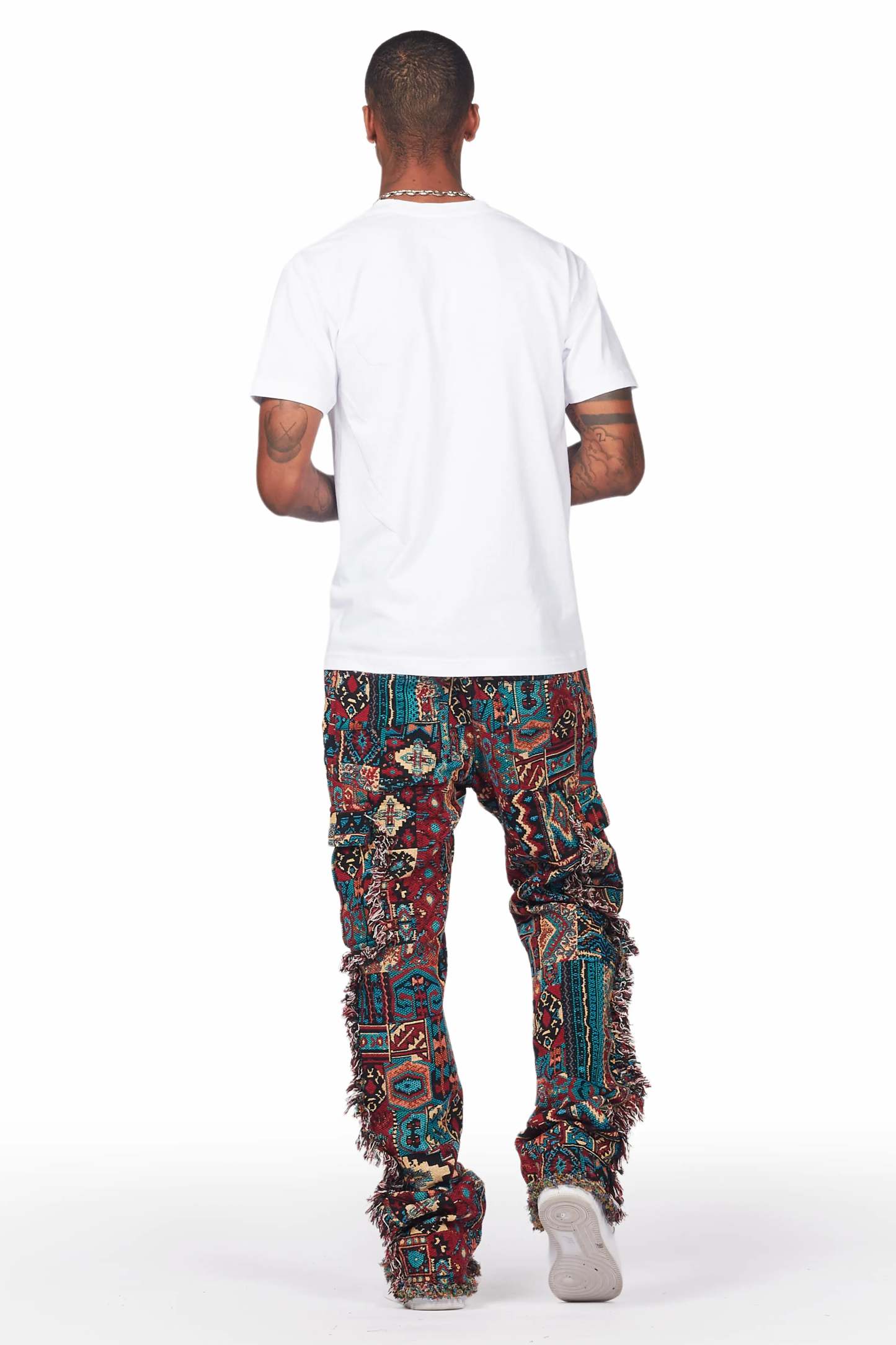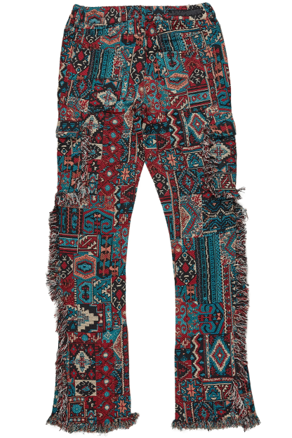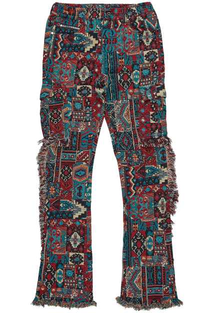 An urban cargo jean for men in red. Designed with organic cotton and custom hand-woven tapestry details for a dope denim streetwear style.