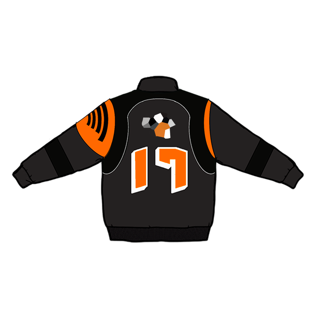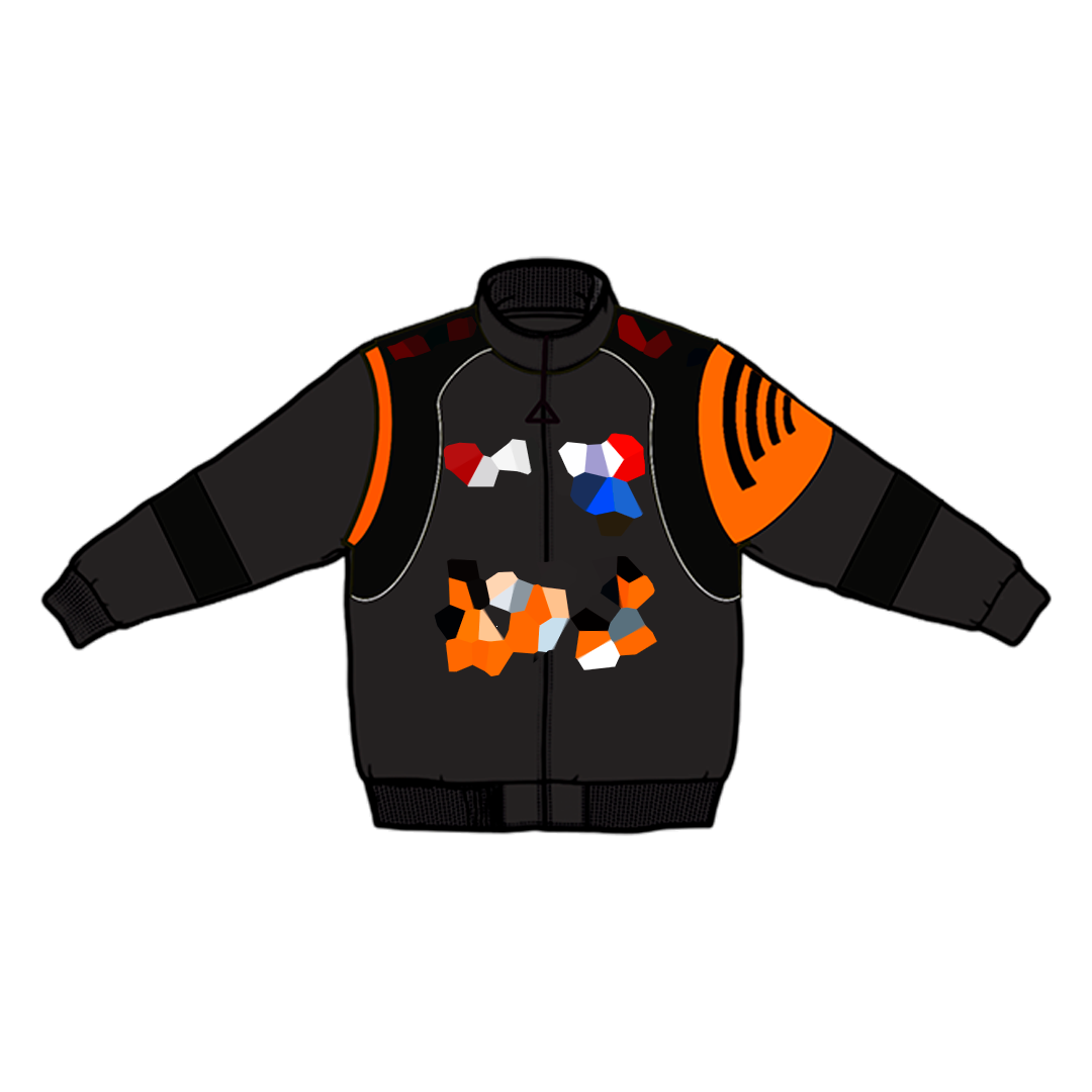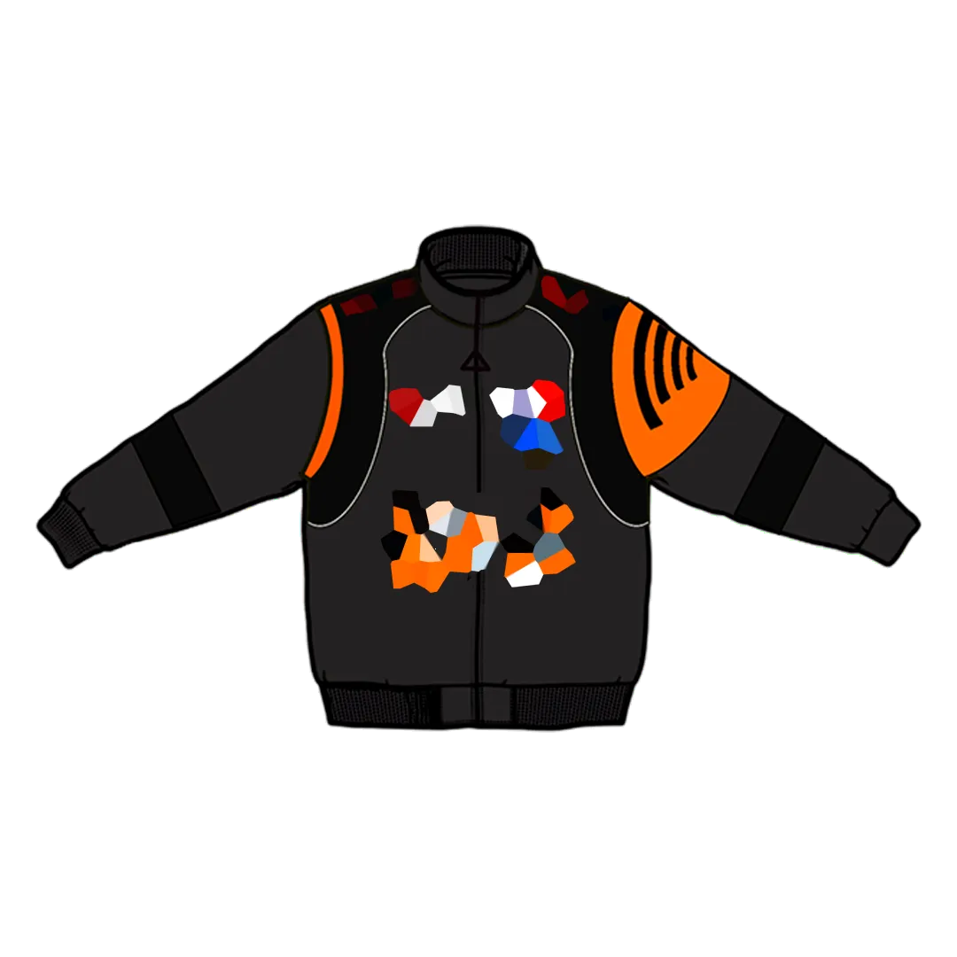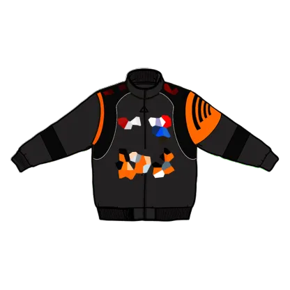 Heavyweight Racing Jacket with embroidery designs on the front, back, and sleeves and an interchangeable rubber patch on the back. This Jacket is made of 100% Polyester. Soft and comfortable, warm and breathable. It has a warm lining on the inside