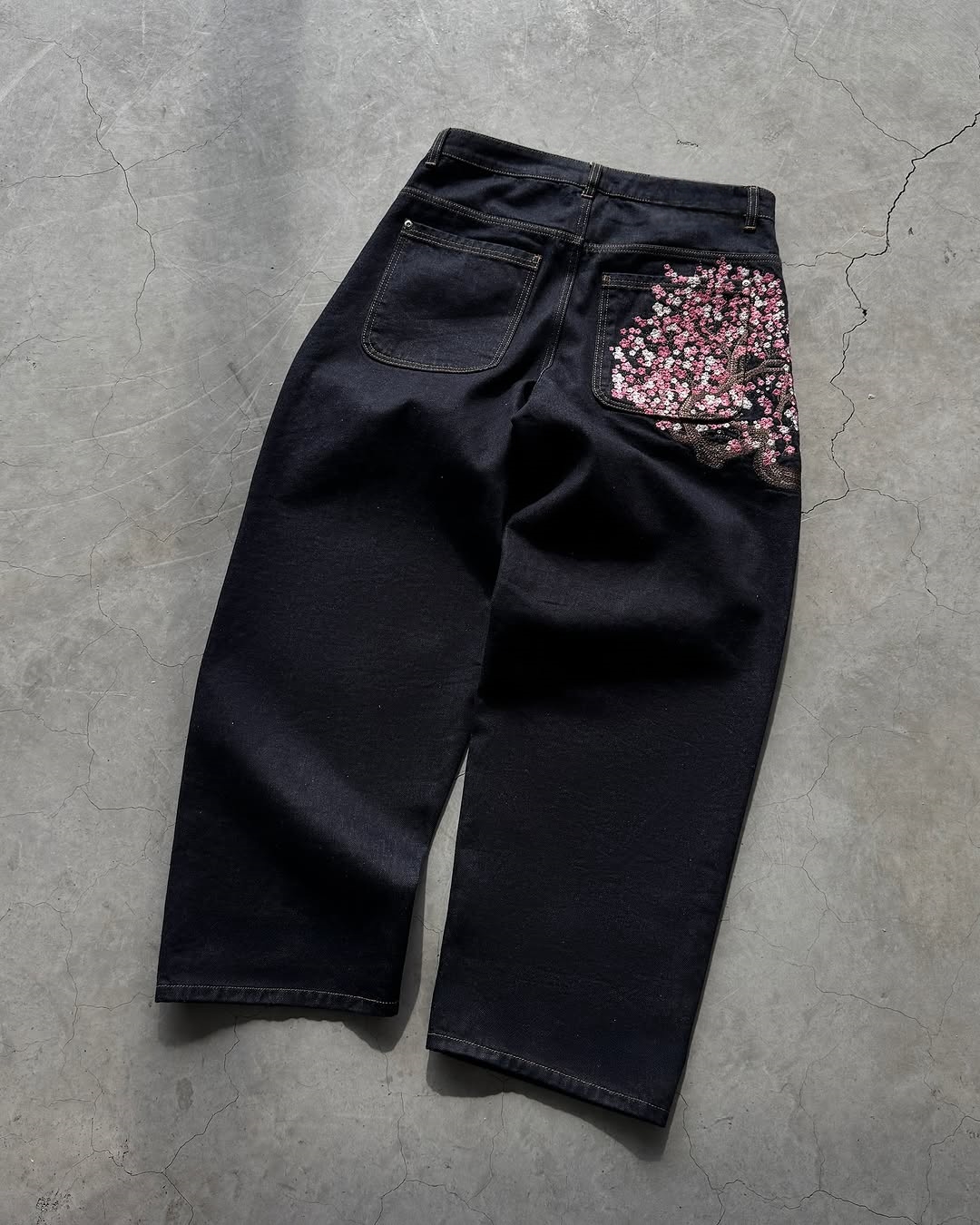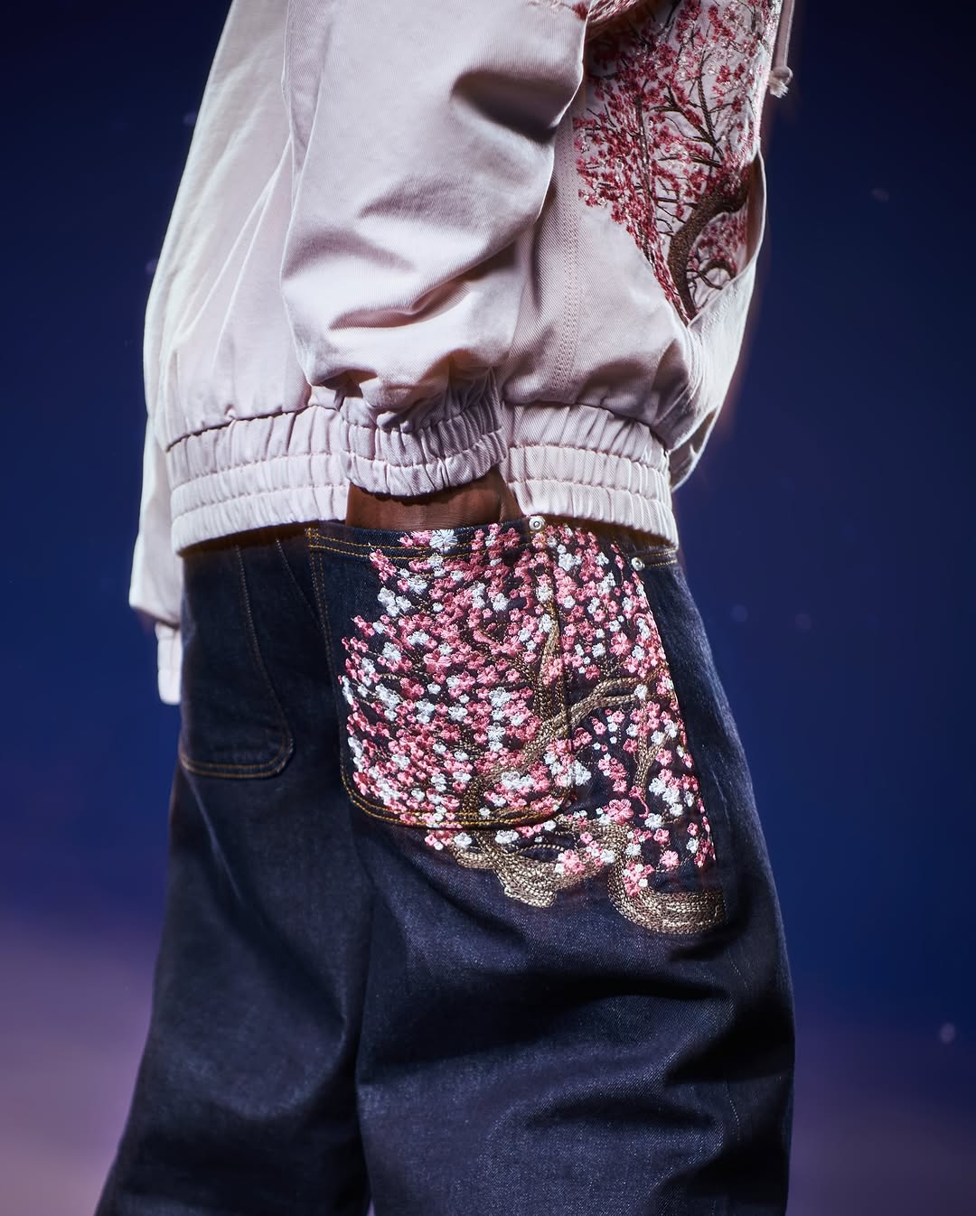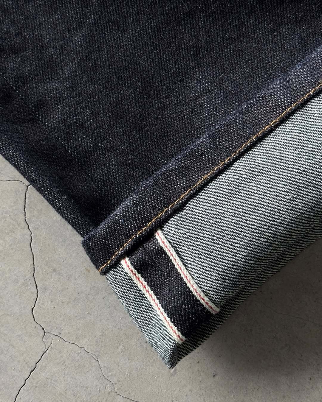 13oz selvedge denim / 100% cotton / embroidery on front and back pocket / embroidered leather patch / balloon fit (different to our usual fit) / fabric may bleed or fade, wash inside out in cold water to preserve color and character / fits true to size