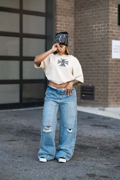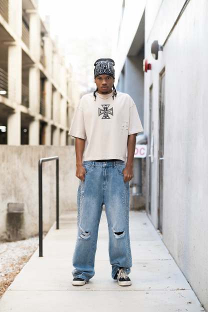 Fit: stretch baggy jeans.
