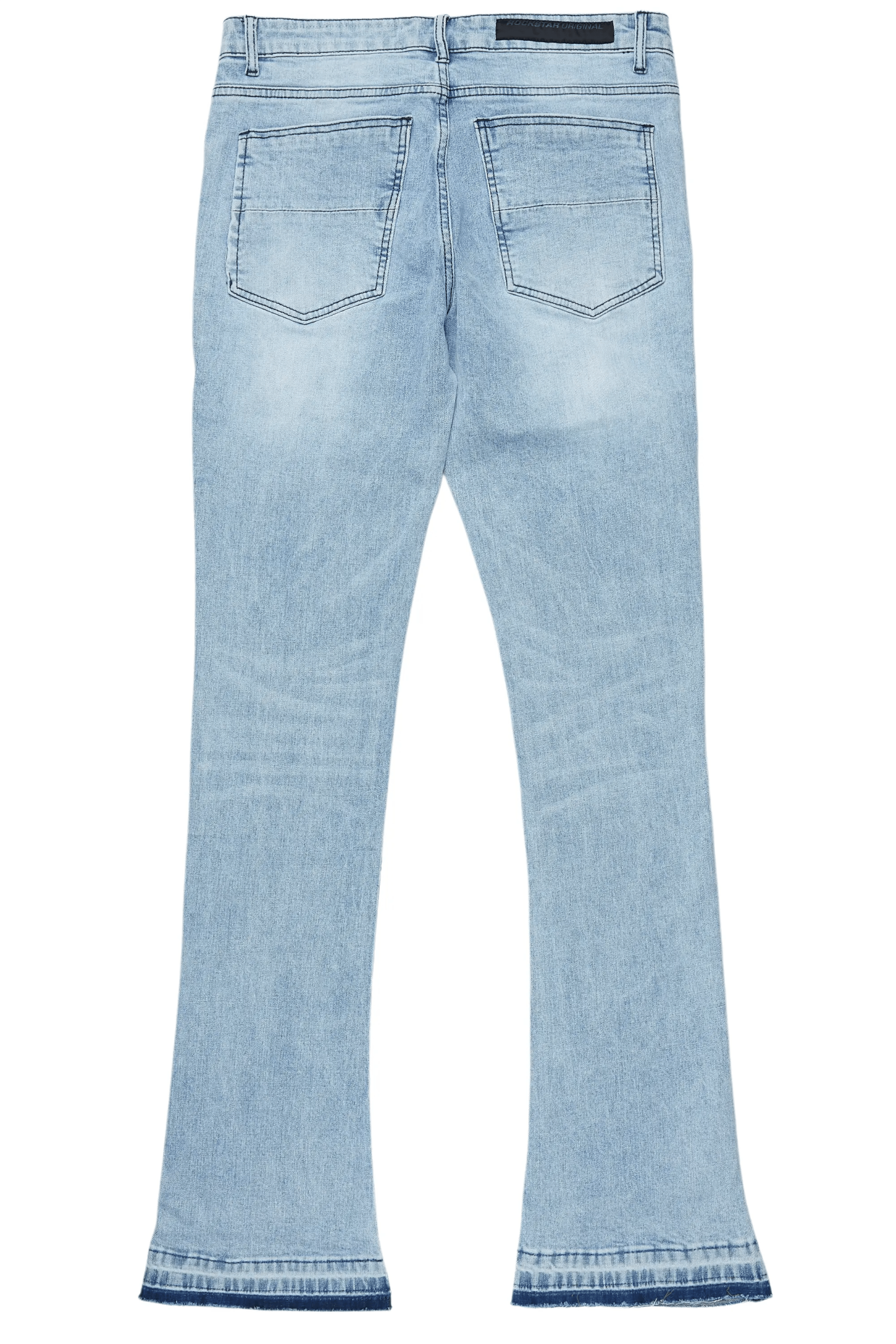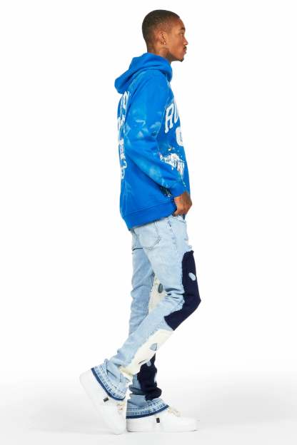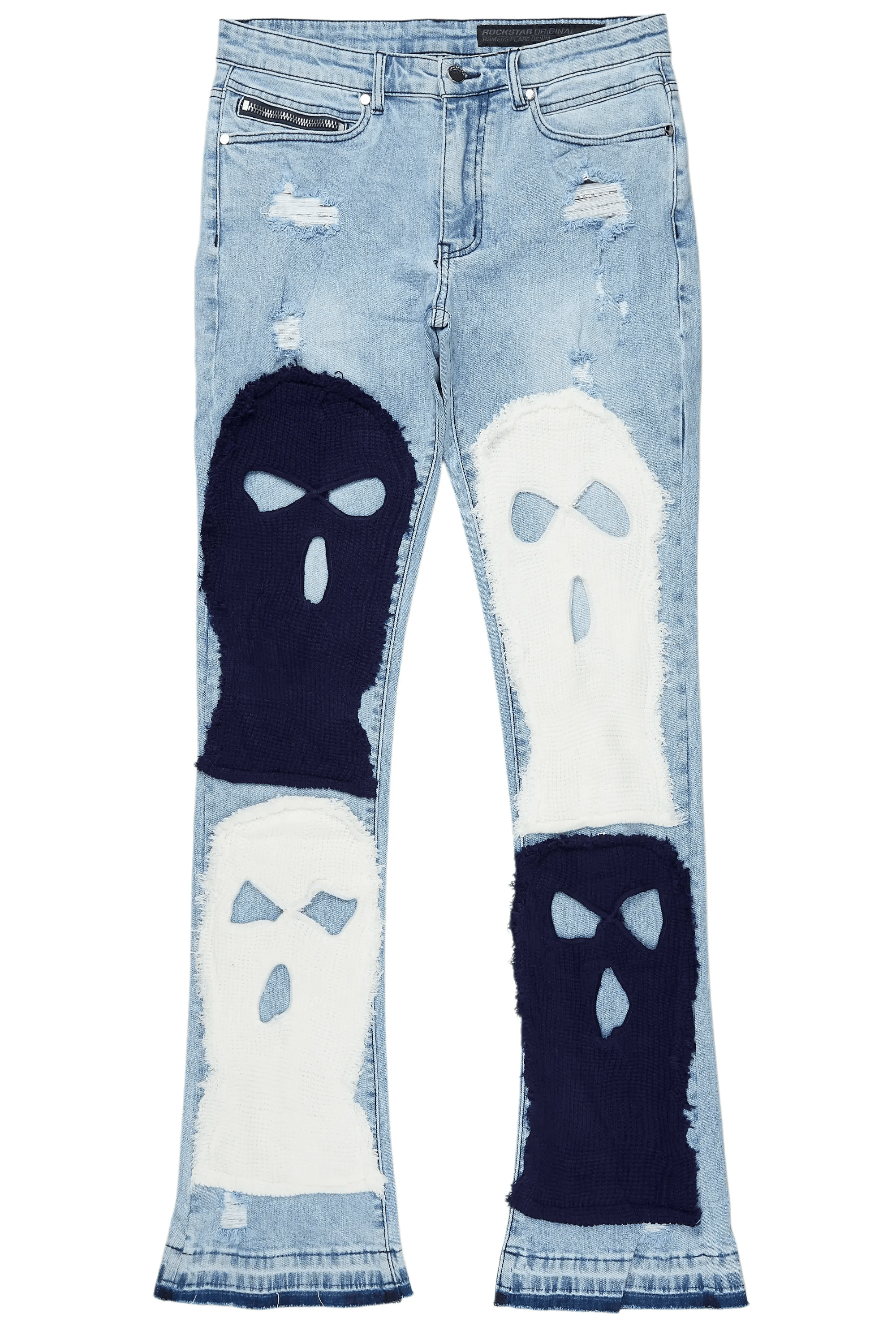 A pair of contemporary stacked patchwork jeans for men in blue. Designed with a retro feel and organic cotton for the perfect everyday style.