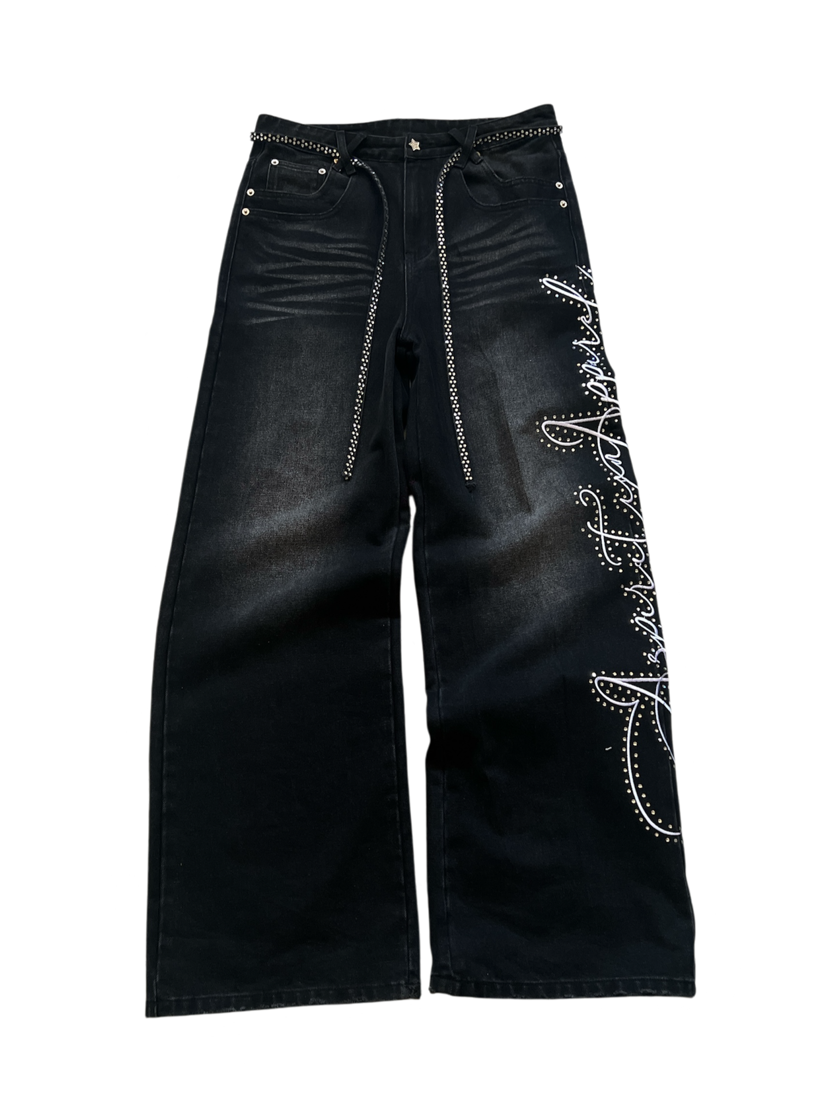 - Denim rhinestone drawstrings (removable)