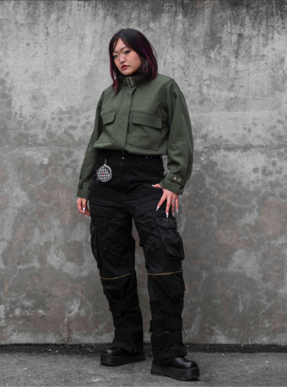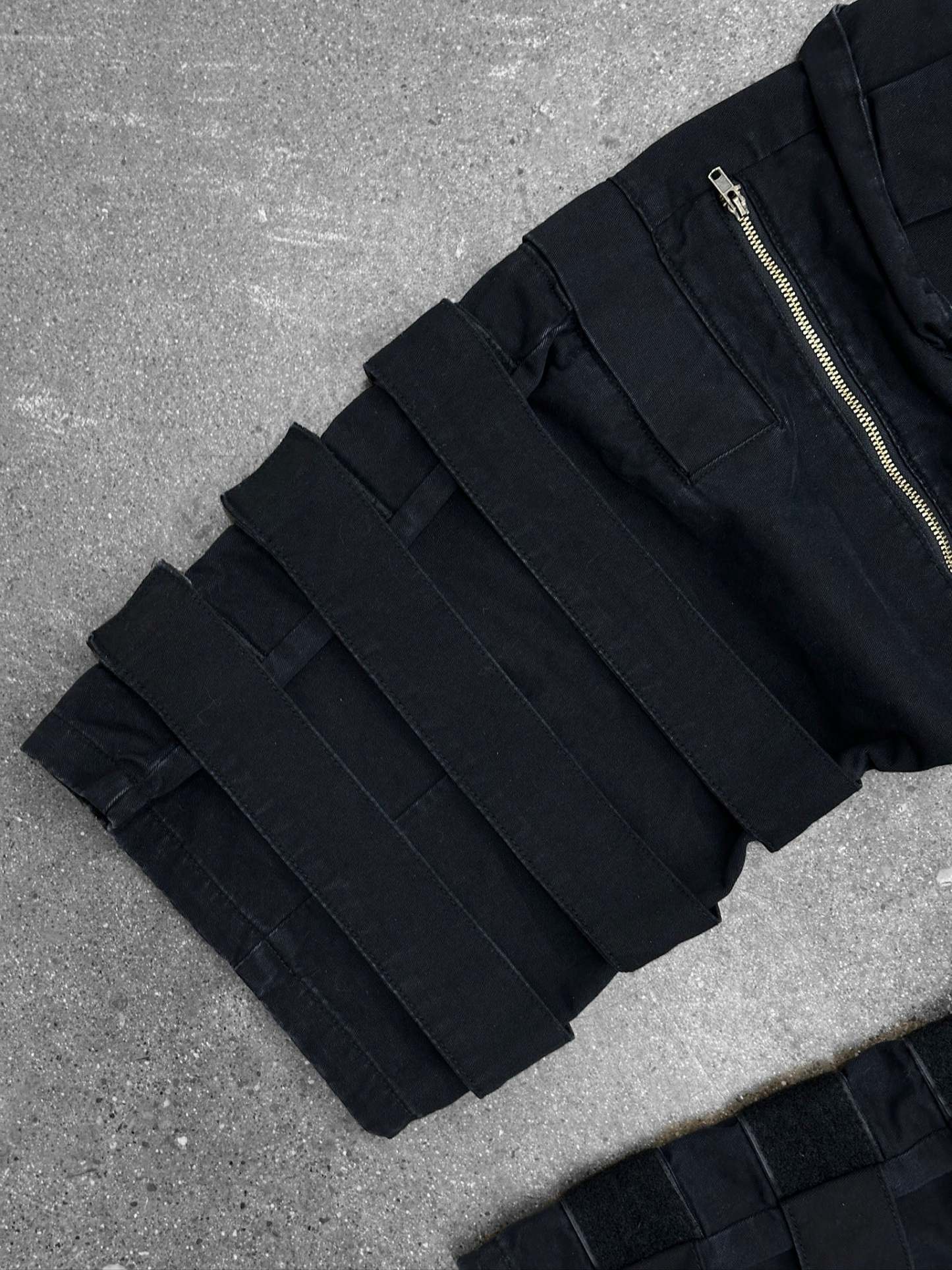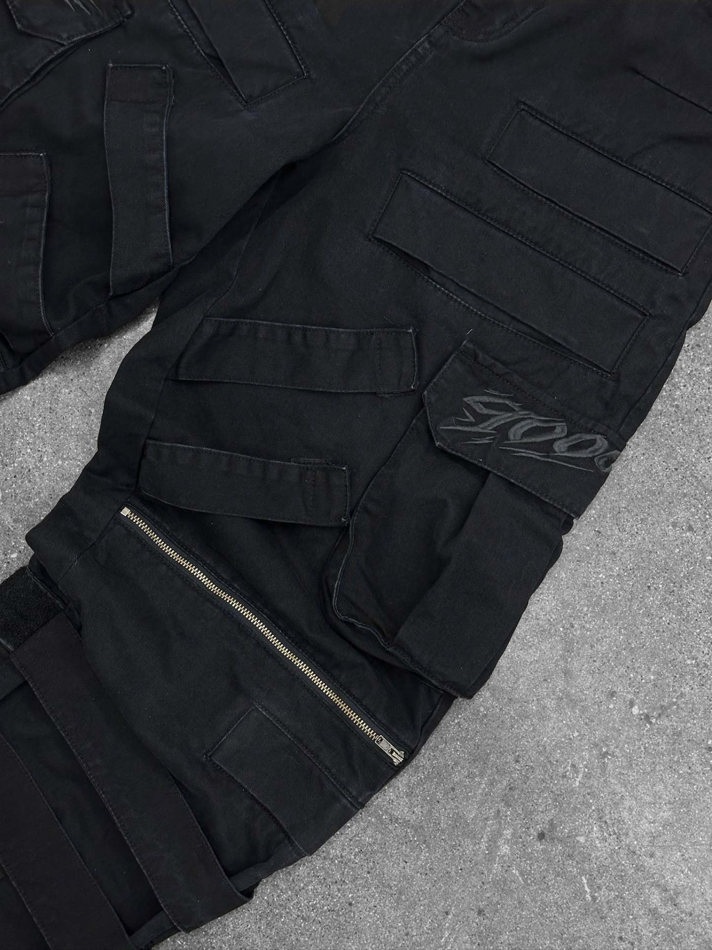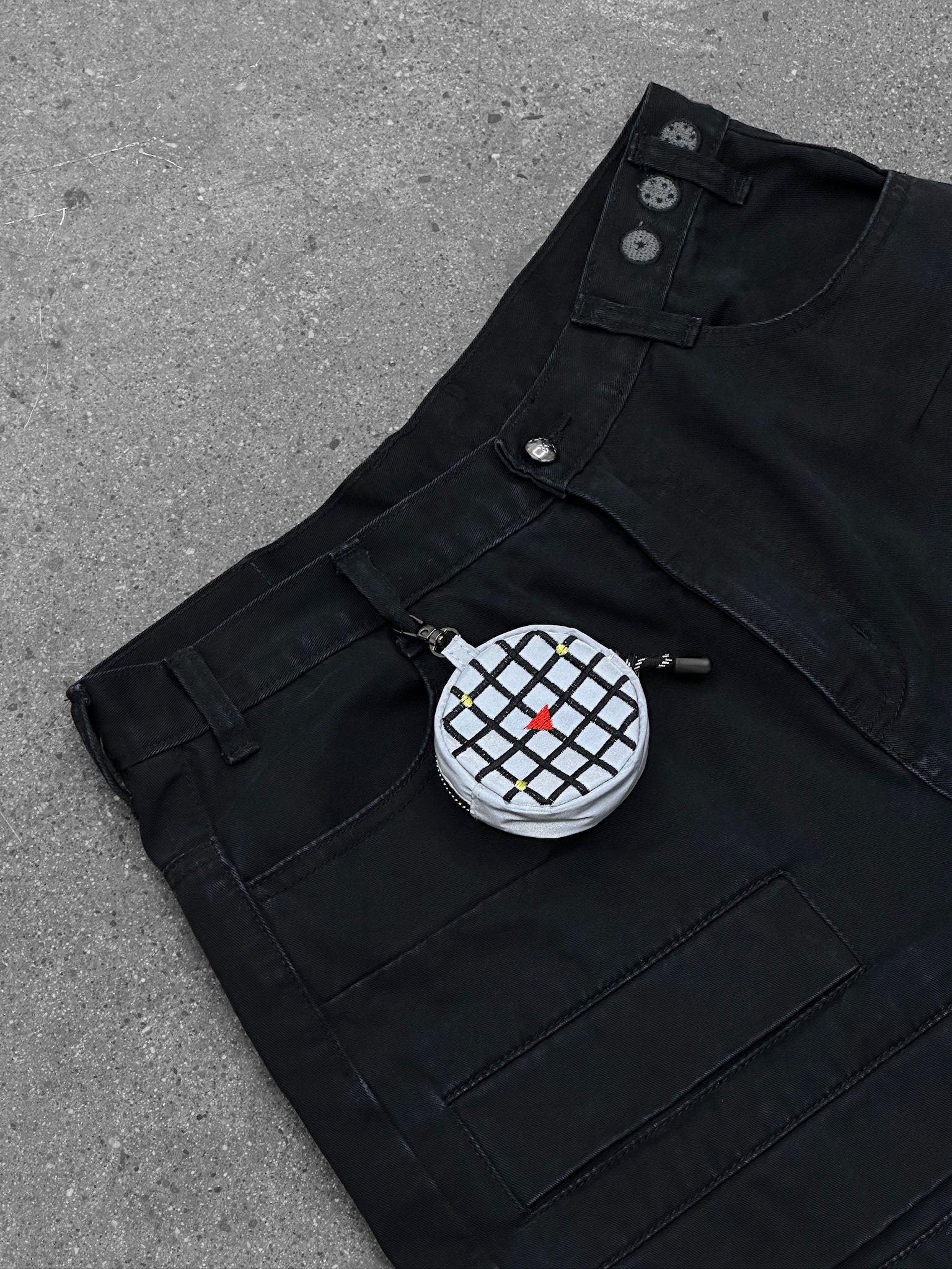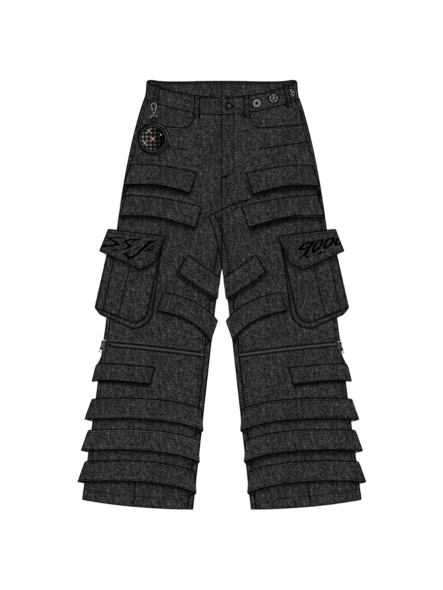 Cargo pants that carry a tactical presence with layered utility built into the silhouette. A detachable coin pocket shaped like a radar device sits at the waist, finished with reflective detailing. Storage spreads across the legs with four additional thigh pockets and an irregular side cargo pocket that shifts the structure away from traditional cargos. Zippers at the knees allow easier movement, while velcro straps at the leg openings tighten or loosen the fit depending on how they’re worn. Subtle embroidered details and hidden placements reveal themselves the closer you look.