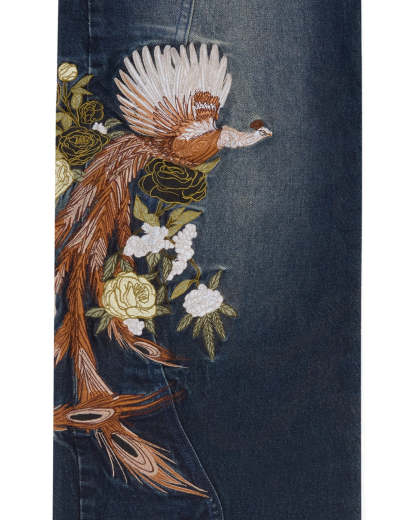 The Eden Denim is cut from heavyweight organic cotton in a deep indigo wash. Detailed peacock and rose embroidery covers each leg, amassing to over 800,000 stitches, with a fully embroidered back pocket hiding the Vescartes name. Finished with custom panelling and premium branded hardware.