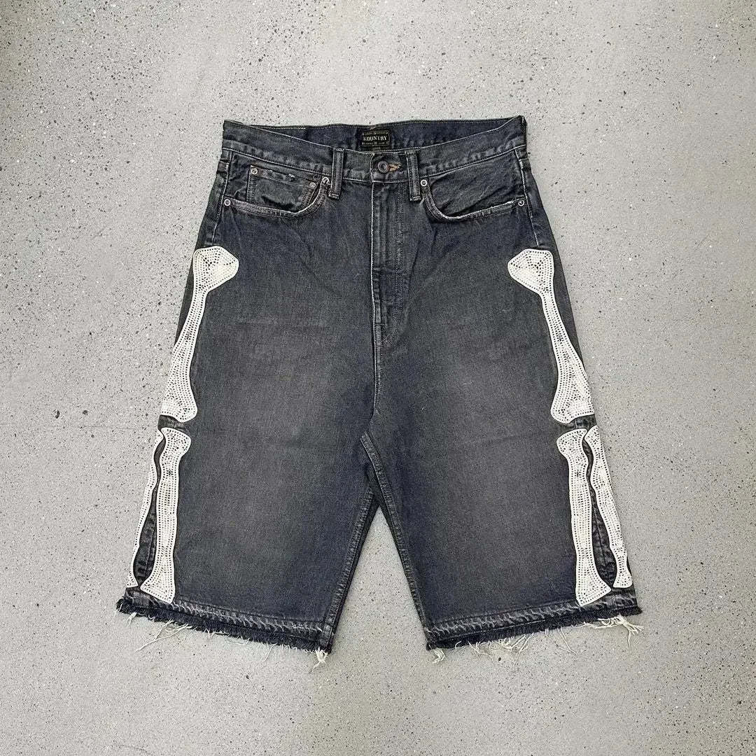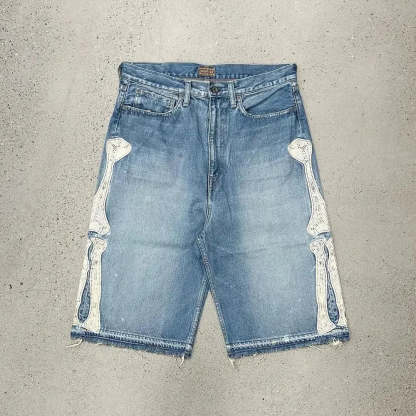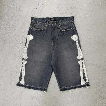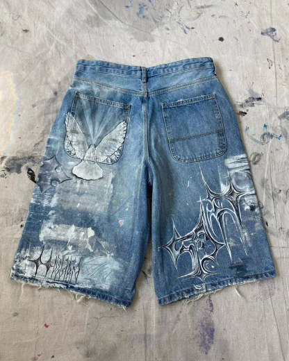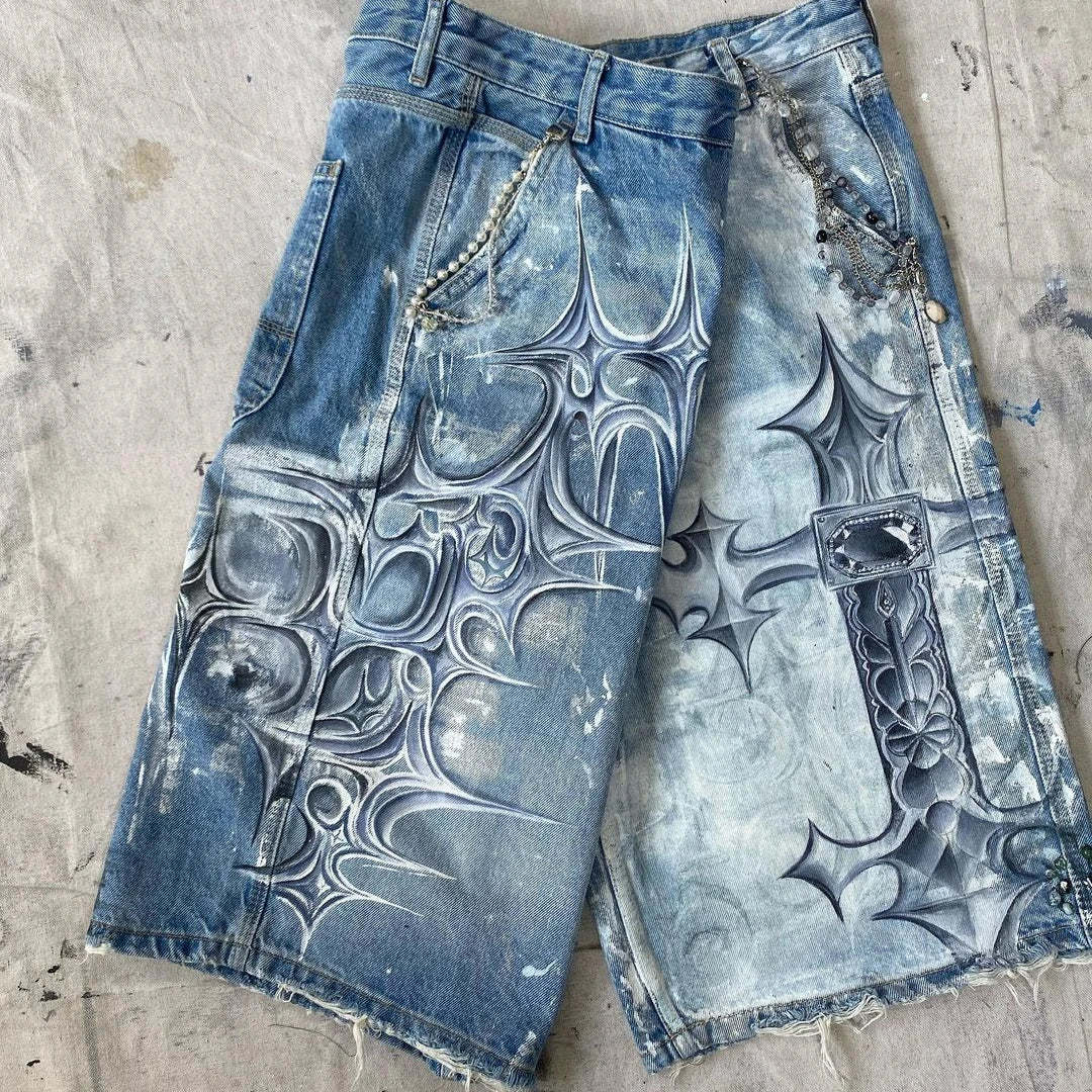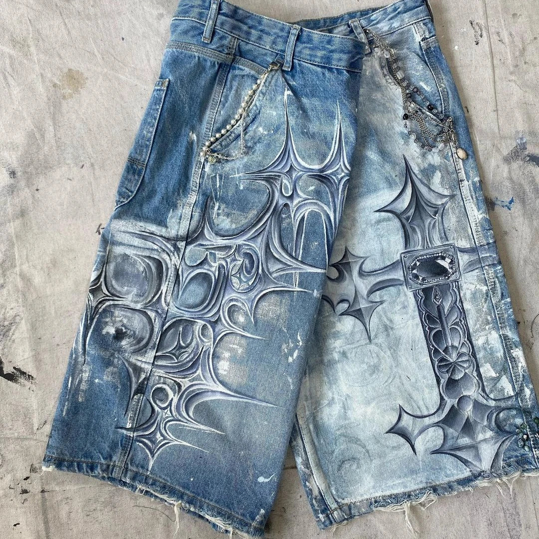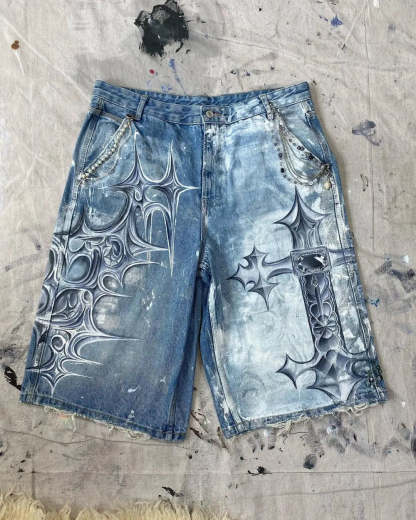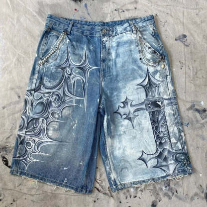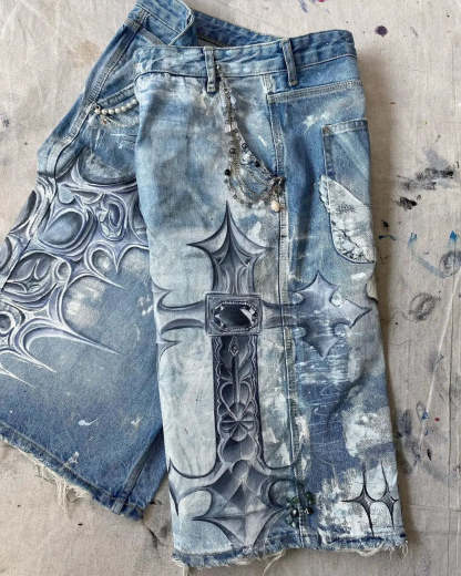 Gothic Trend New Hand-painted Cross Printed Short Jeans Men's Loose Straight Five-point Jeans Street Hip-hop Rap Y2K Shorts