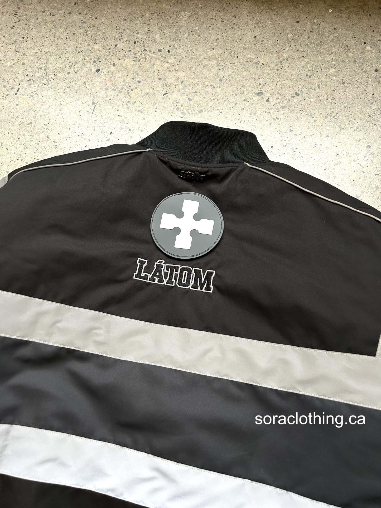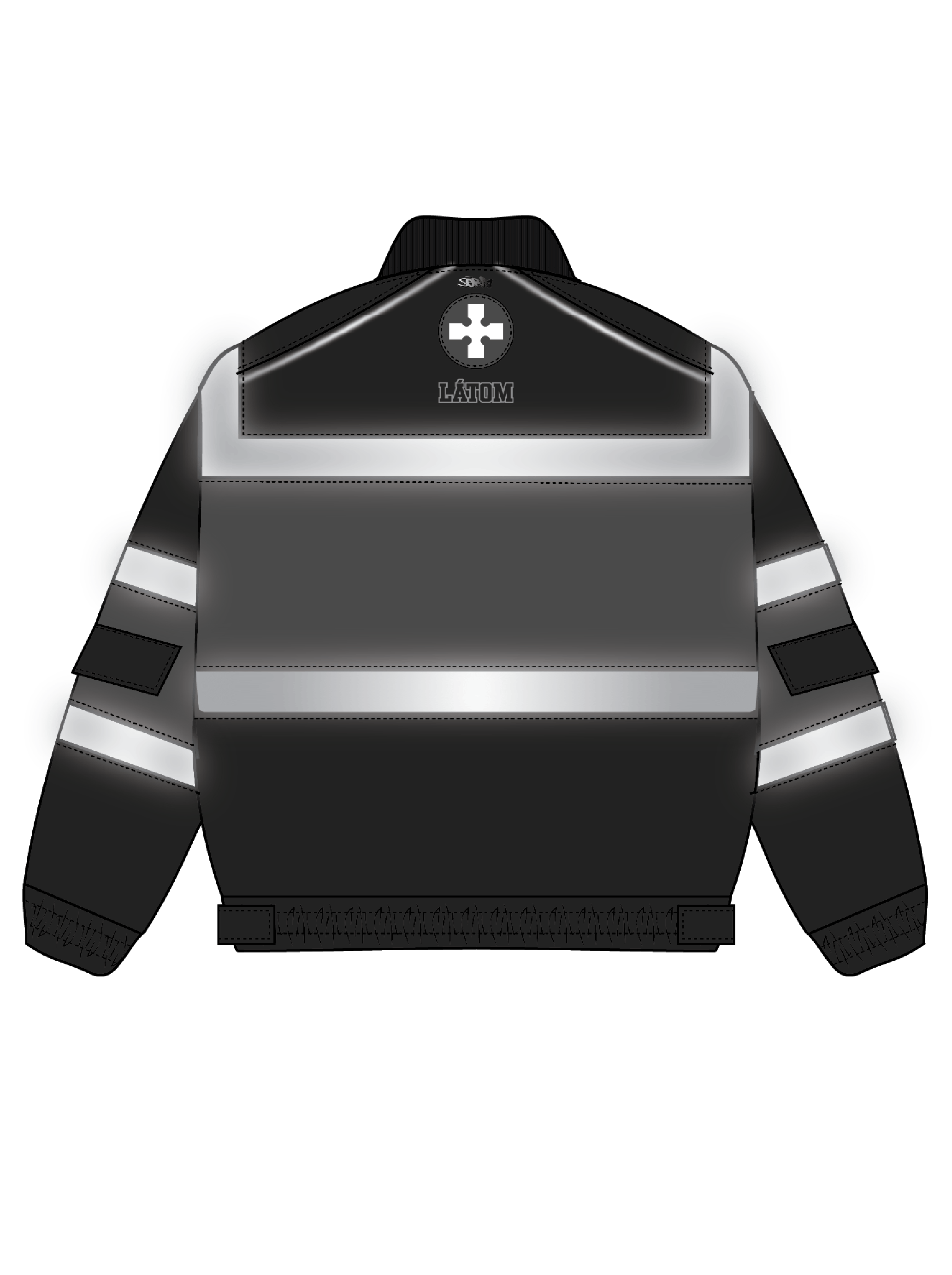 Heavyweight winter insulated jacket with embroideries on the front, back, and sleeves and a rubber patch on the back. This Jacket is made of 100% Polyester. Soft and comfortable, warm and breathable. Reflective lines reflect light and glow in the dark. Comes with backpack straps on the inside.