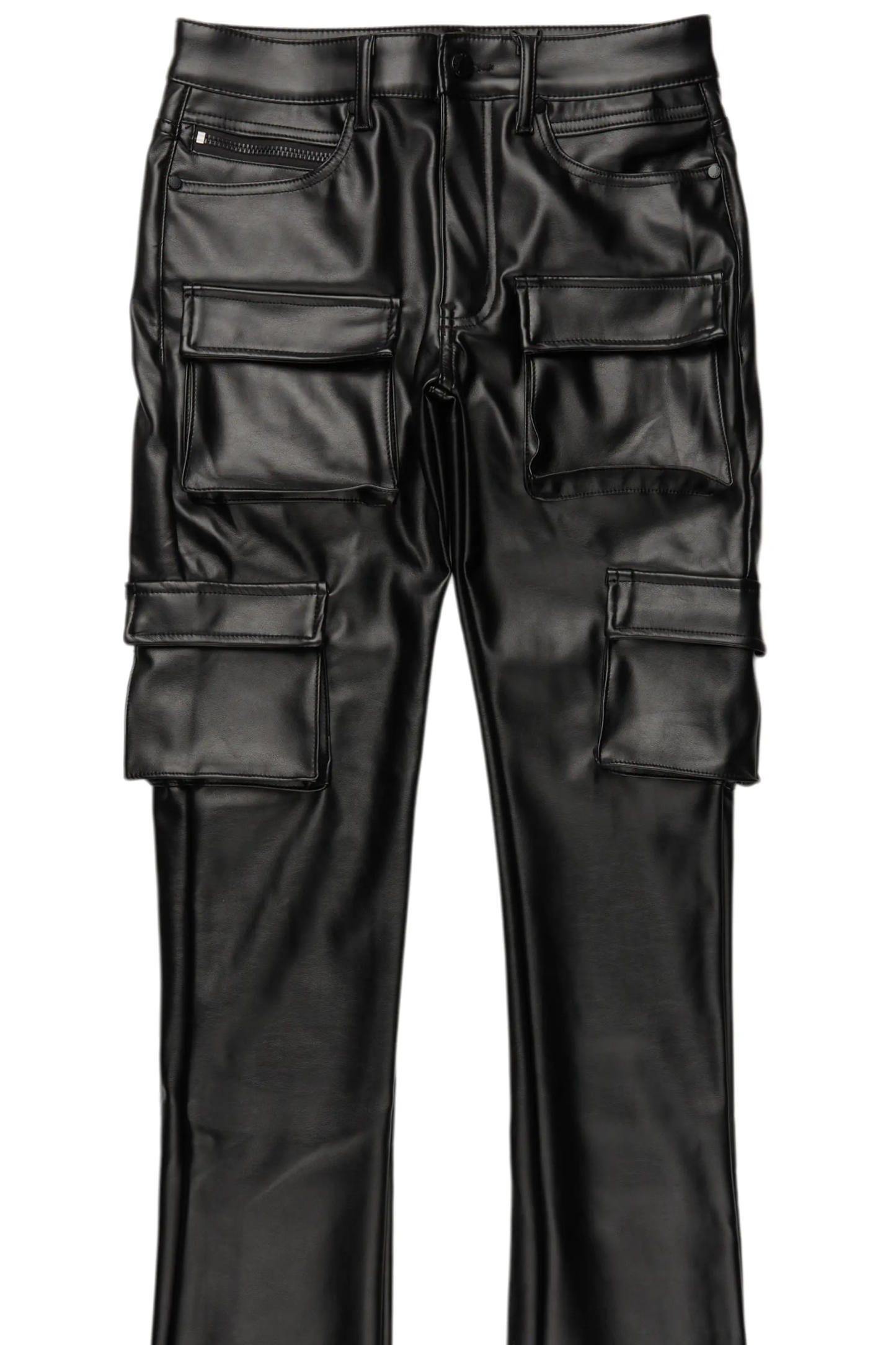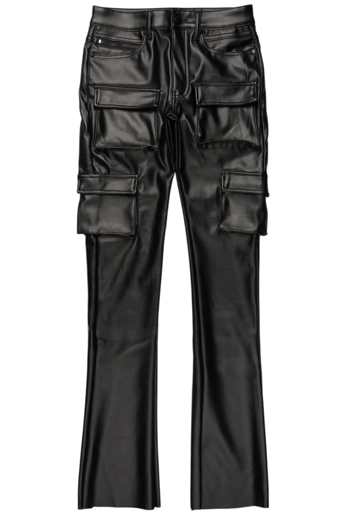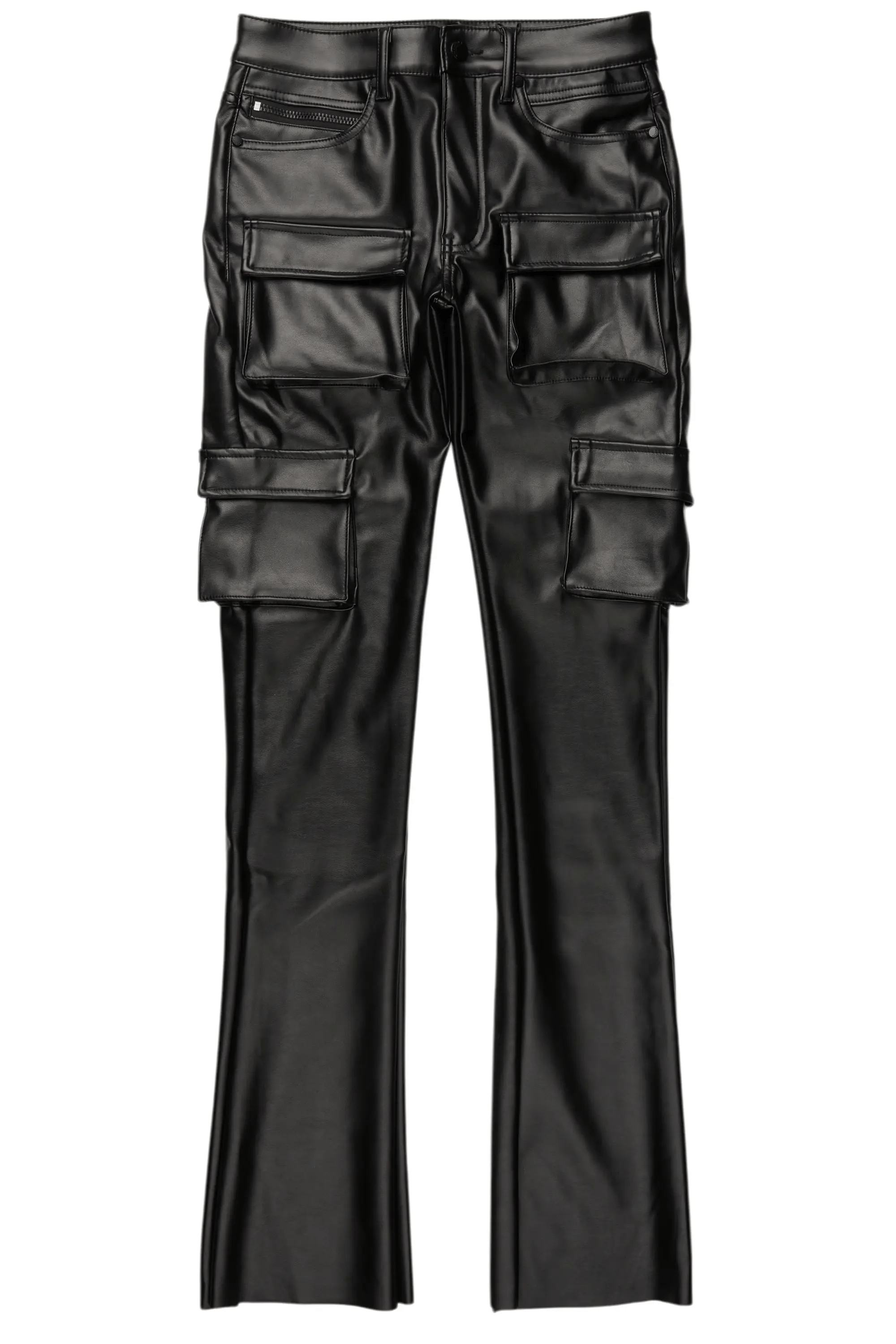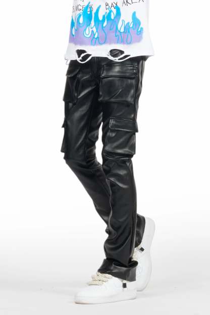 An urban stacked cargo jean for men in black. Designed with premium PU fabric and utility pockets for a must-cop denim streetwear style.