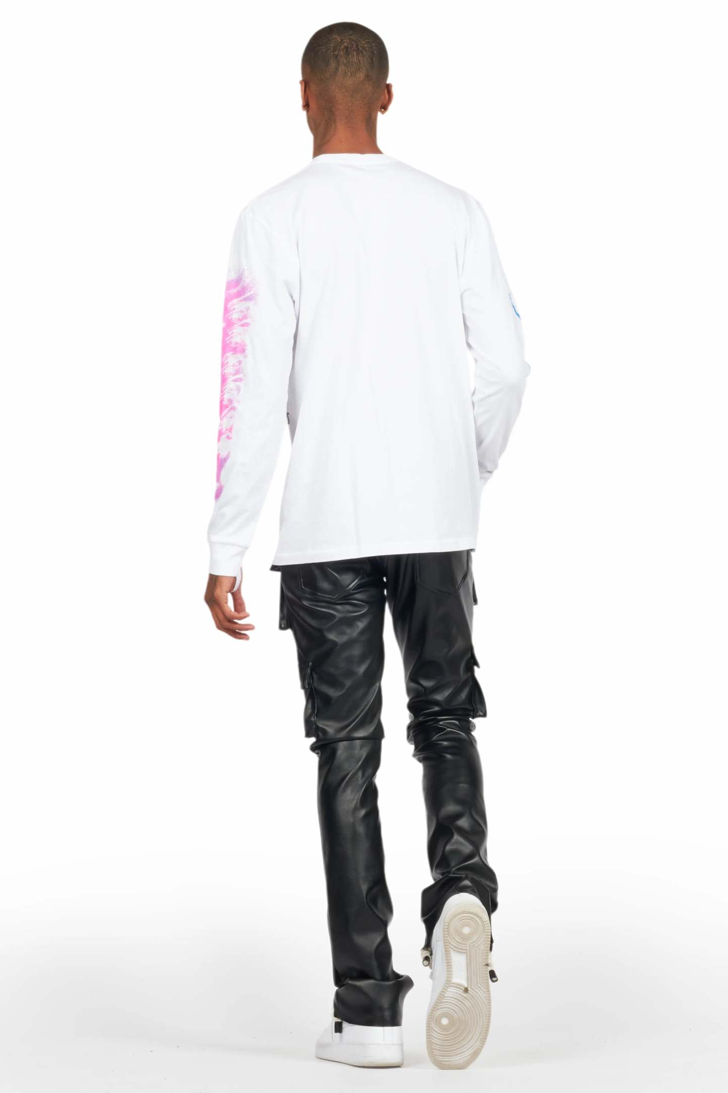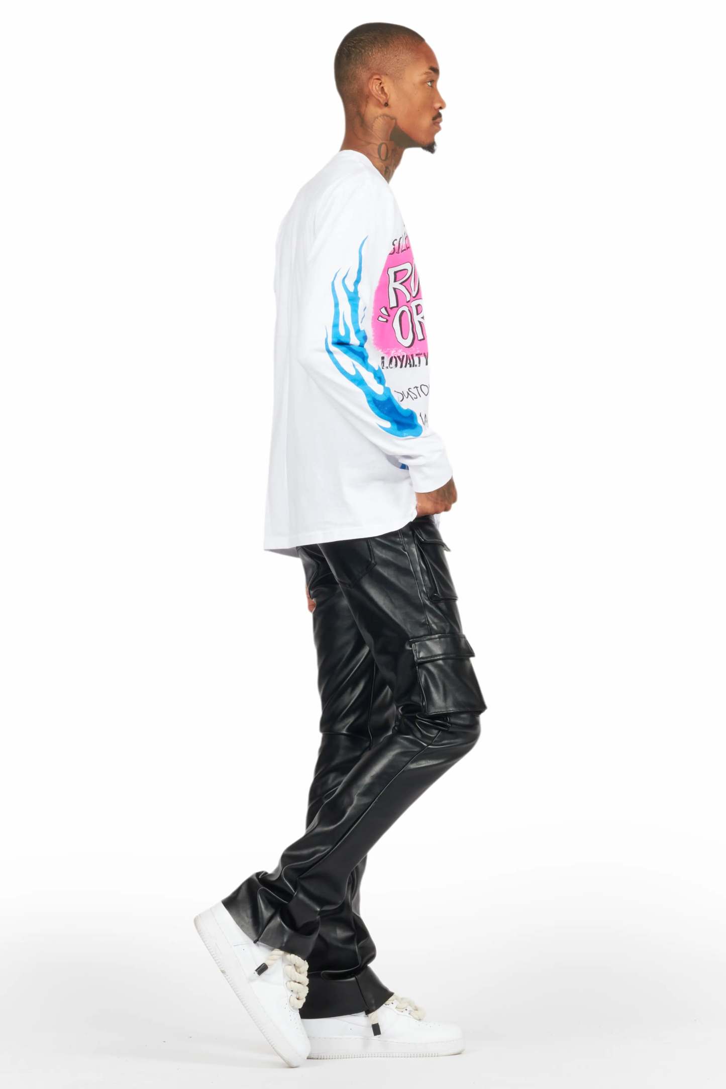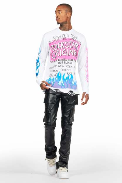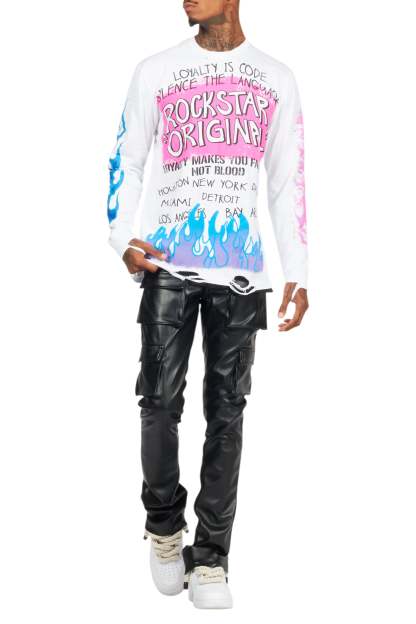 An urban stacked cargo jean for men in black. Designed with premium PU fabric and utility pockets for a must-cop denim streetwear style.