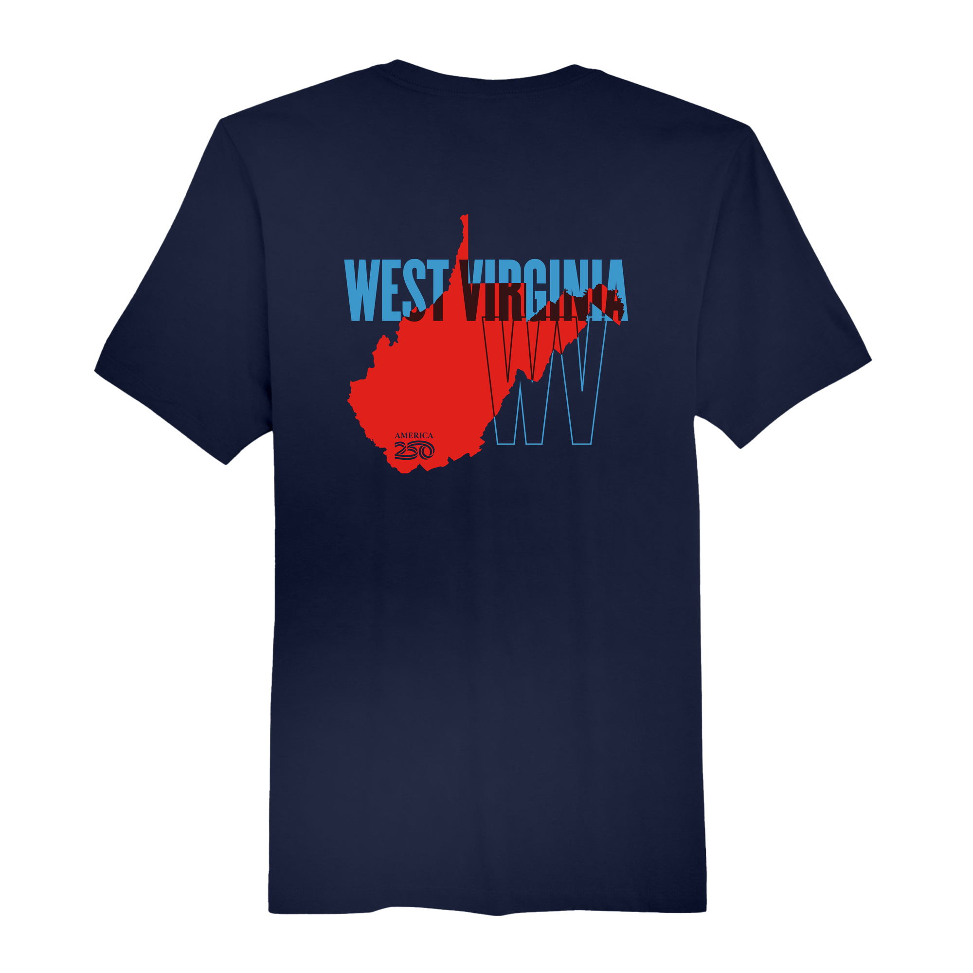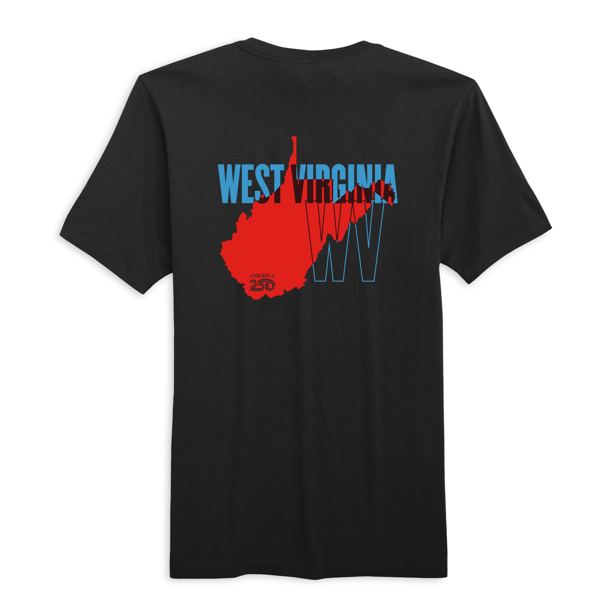 Celebrate the Mountain State�s unique place in American history with the Official America250 West Virginia Clothing Collection. This distinctive design?proudly features the iconic America250 logo on the front, honoring 250 years of American independence. On the back, a bold outline of West Virginia?paired with �West Virginia� text?creates a meaningful tribute to state pride and national heritage.