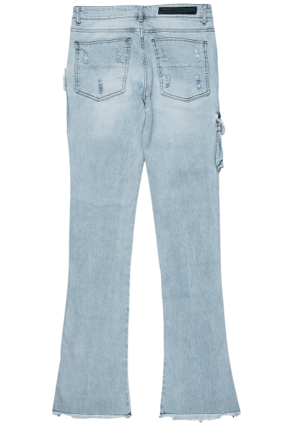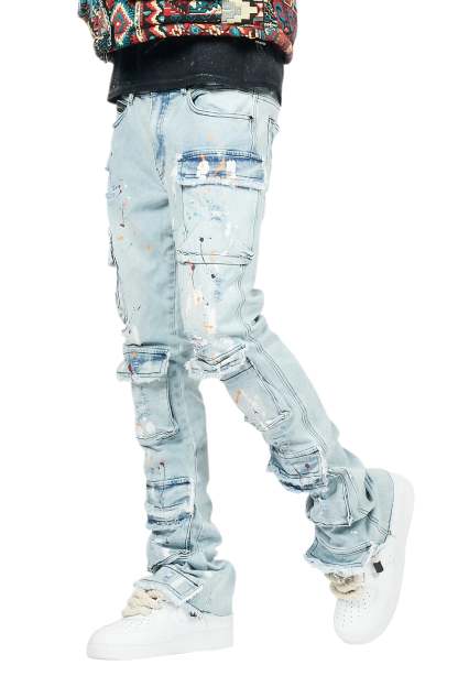 An urban stack denim cargo jean for men in blue. Designed with organic cotton and extra long legs for an essential streetwear style.