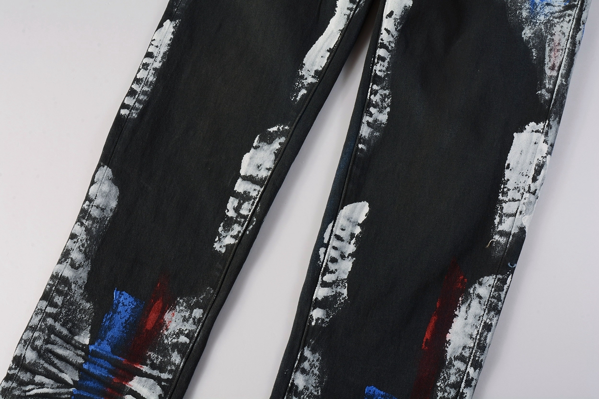 Distressed gray stretch cotton distressed paint splatter slim fit jeans from Purple Brand.