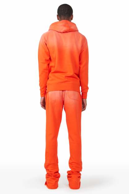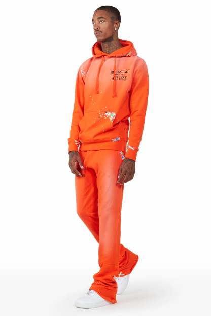 An urban two-piece super stack flare track set for men in orange. Designed with extra long legs and custom paint splatter detailing for a dope streetwear set.