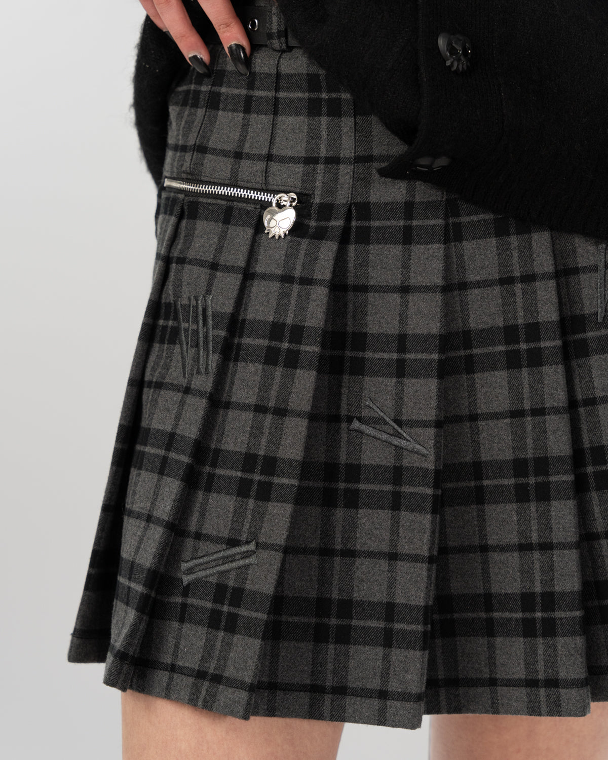 - Front pocket with custom heart skull zip pull