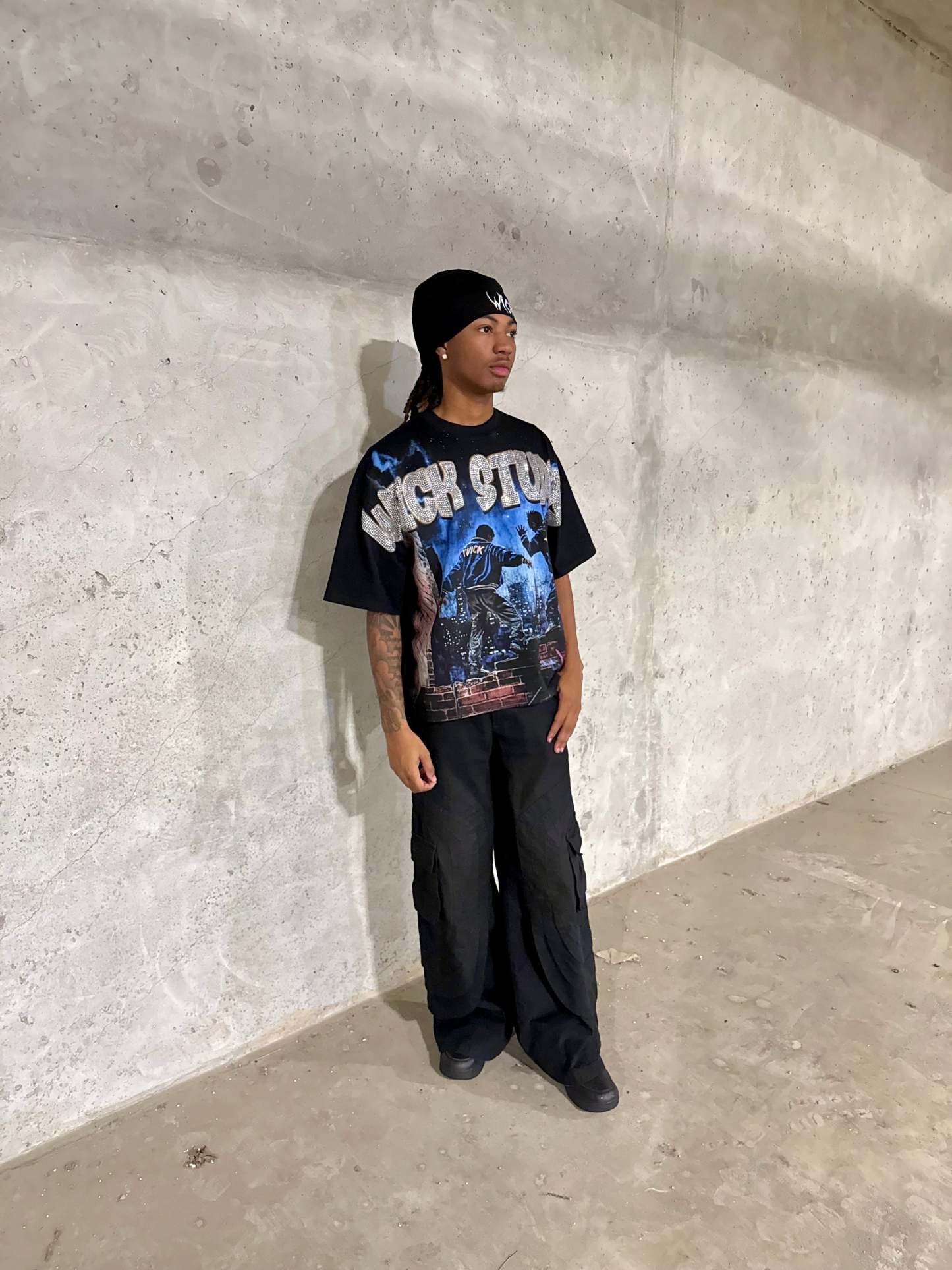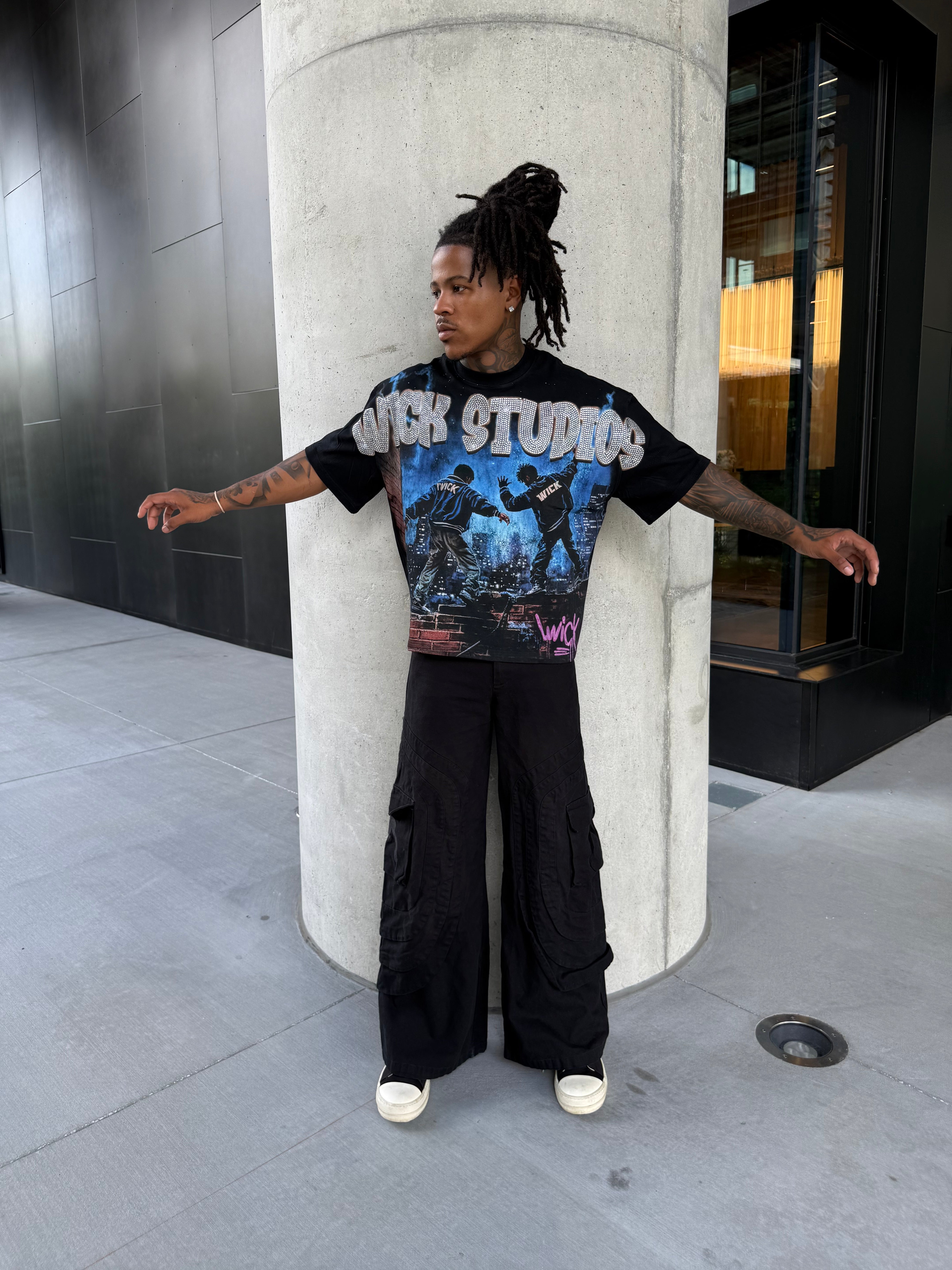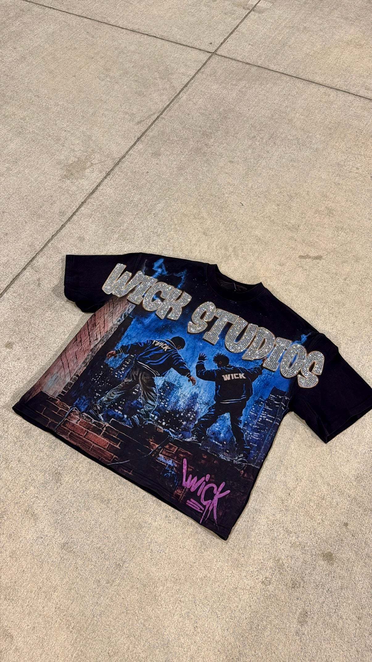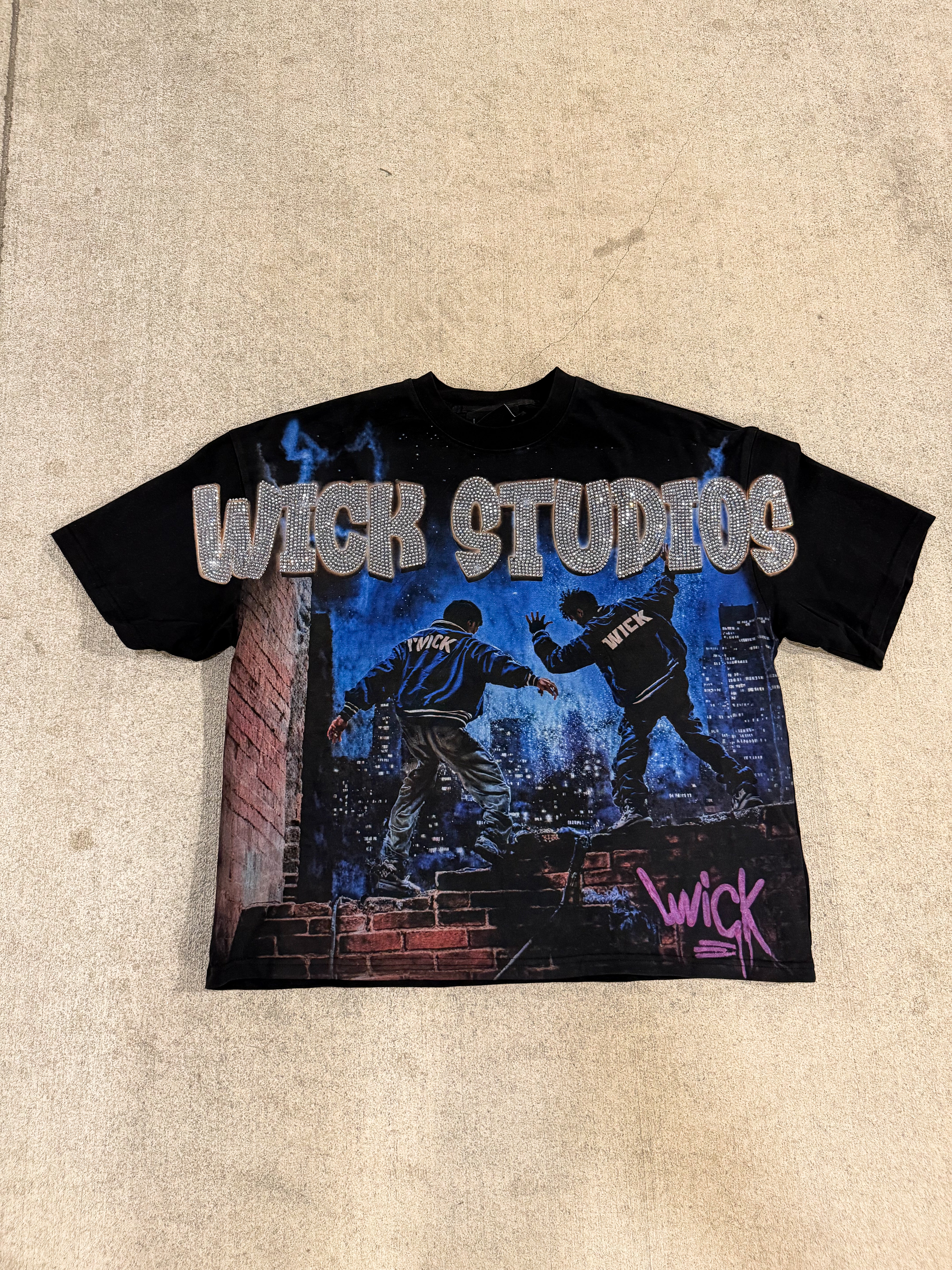 The design is topped with oversized “WICK STUDIOS” rhinestone-style lettering that glistens with attitude, while the signature pink graffiti-style “WICK” tag in the corner adds a raw, artistic touch. Made for those who move differently, this tee captures the energy of city life and the fearless spirit of the Wick movement.