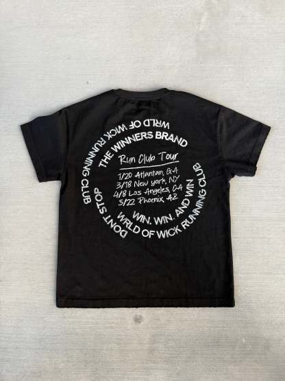 Heavyweight heat for the streets 🏁 This 300GSM tee blends bold athletic energy with streetwear edge. Front graphic repping the WRLD OF WICK Running Club, back tour dates locked in a Winners Brand circle print. From ATL to PHX—this is more than a tee, it’s a movement.